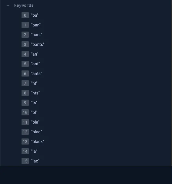 이 함수는 입력된 텍스트의 모든 2~10 글자 부분 문자열을 생성합니다. 예를 들어, “hello” 에서 “he”, “hel”, “hell”, “hello”, “el”, “ell”, “ello”, “ll”, “llo”, “lo” 와 같은 키워드가 생성됩니다.
